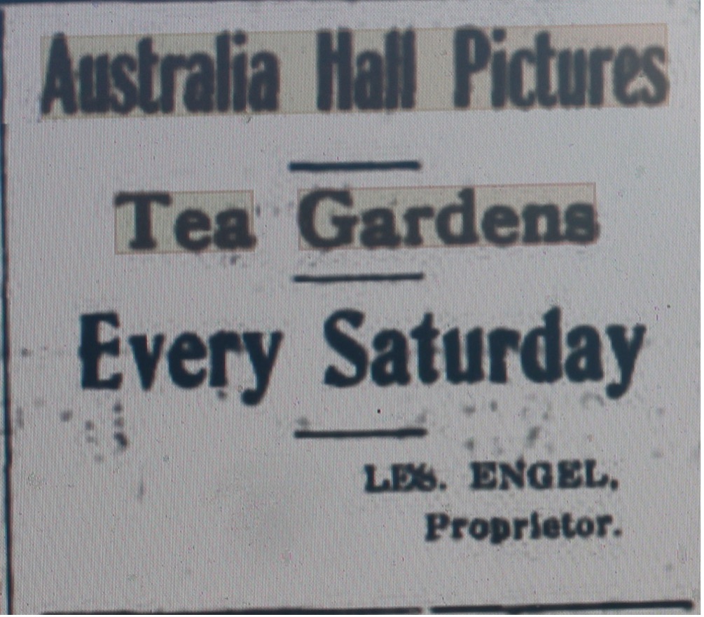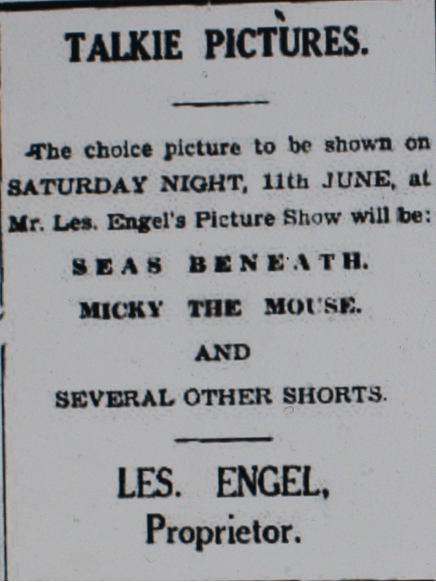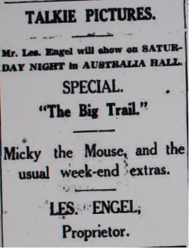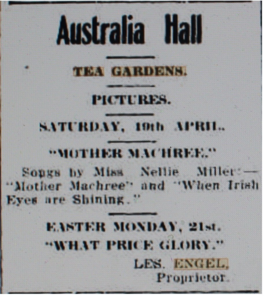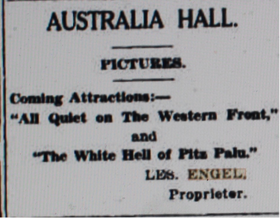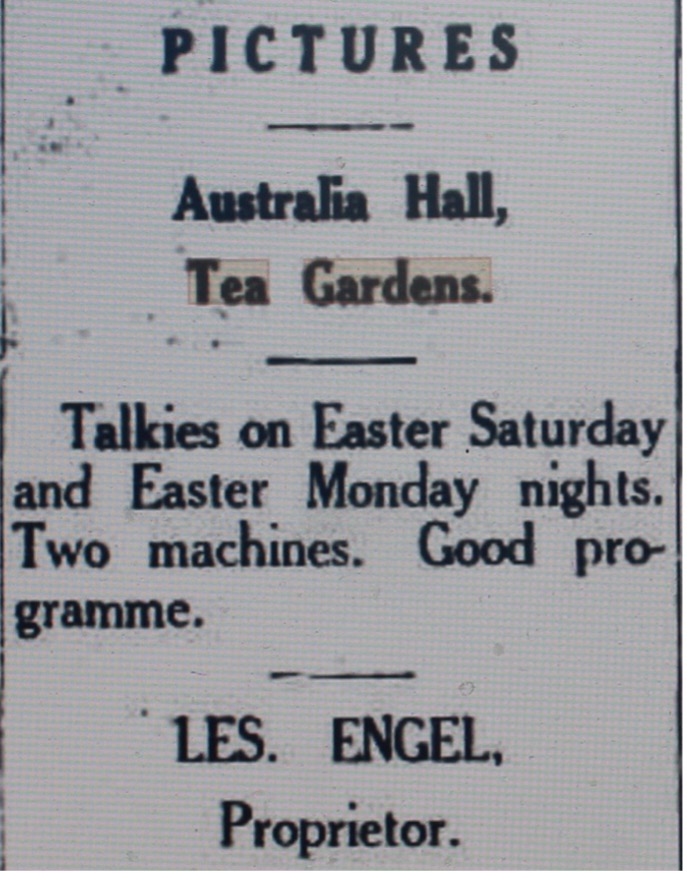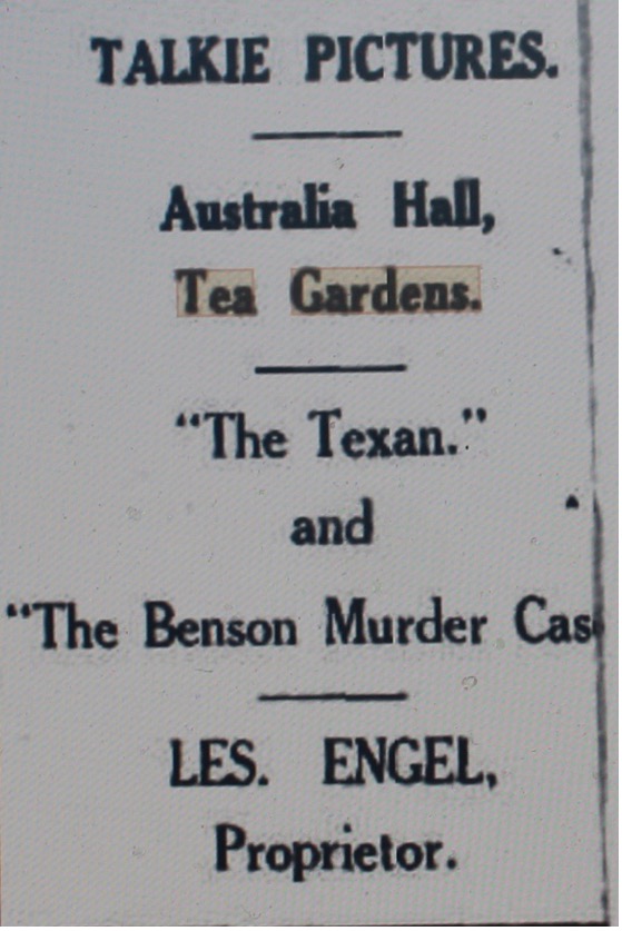 ‘Mr. Les. Engel, Australia Hall, Tea Gardens, gave a free show on Thursday night last. This is not the first occasion that Mr. Engel has provided gratuitous pictures and many who are feeling the effects of the depression appreciate his generosity, and no doubt look forward to the time when they will show their appreciation. Mr. Percy, travelling picture showman presented “All Quiet on the Western Front” on Saturday night last, and had a good house. This silent picture is not a true reflex of the novel itself. Those who have read the book consider it is just as well.’