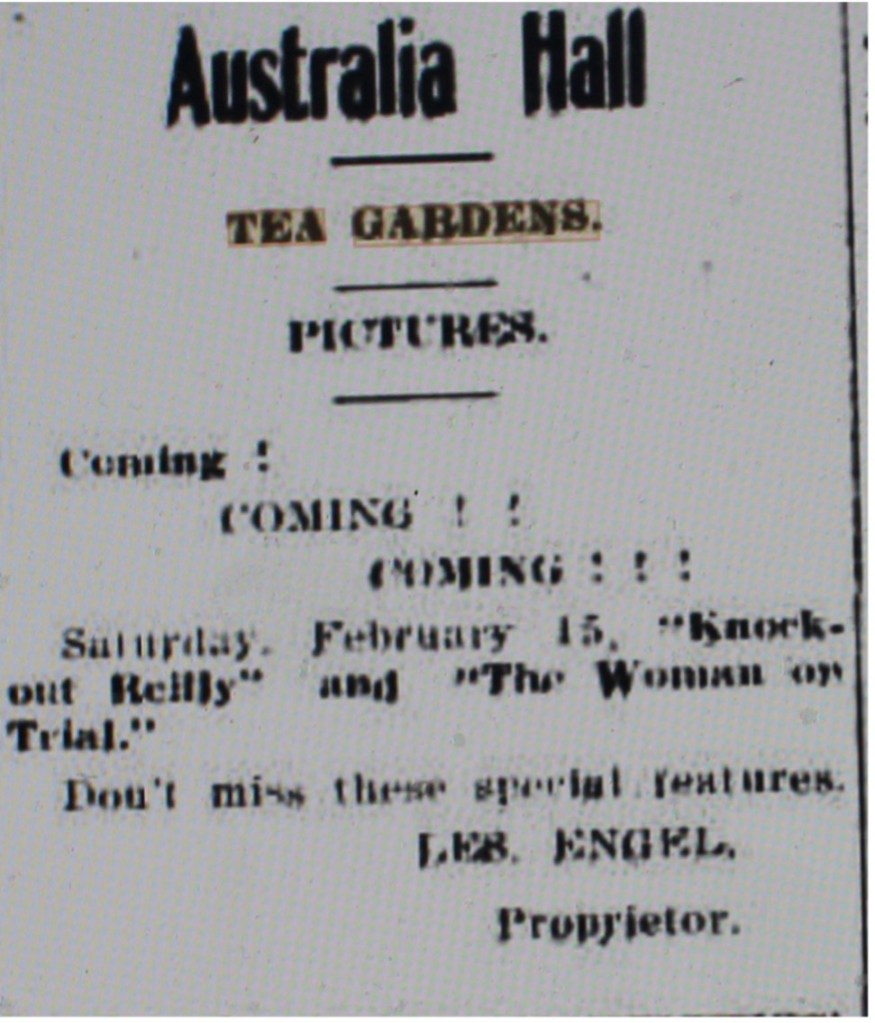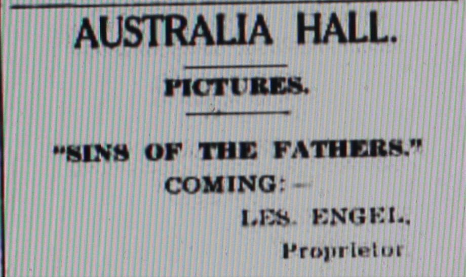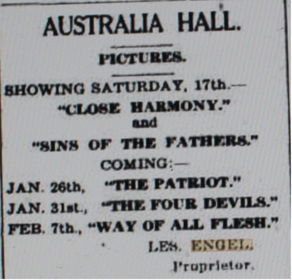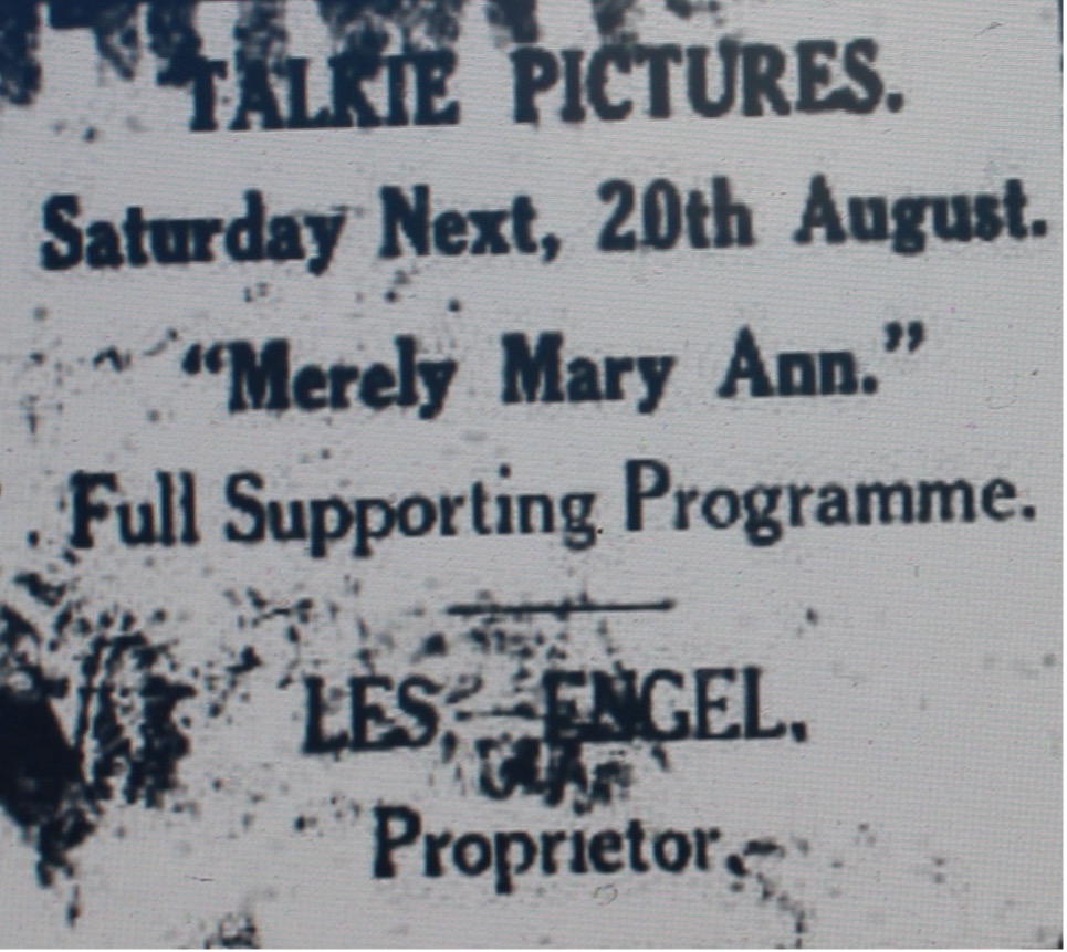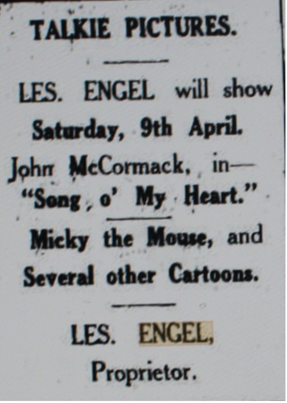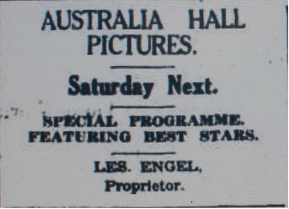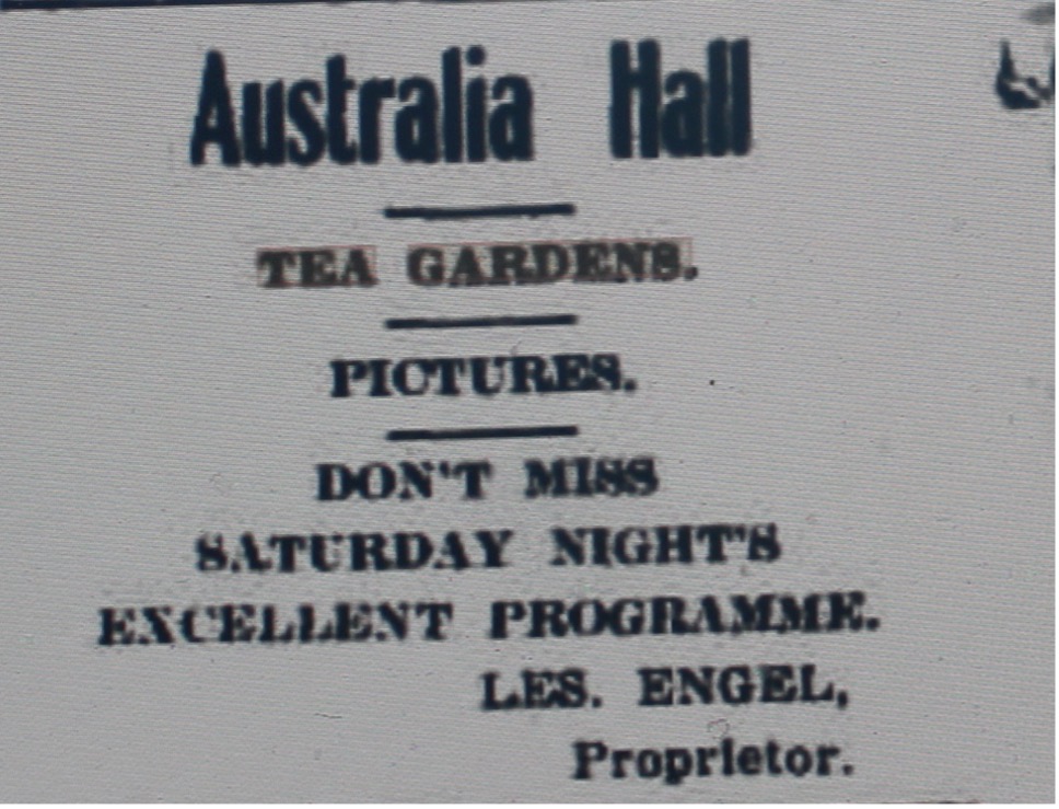 ‘Mr. Les. Engel, Australia Hall, Tea Gardens, gave a free show on Thursday night last. This is not the first occasion that Mr. Engel has provided gratuitous pictures and many who are feeling the effects of the depression appreciate his generosity, and no doubt look forward to the time when they will show their appreciation. Mr. Percy, travelling picture showman presented “All Quiet on the Western Front” on Saturday night last, and had a good house. This silent picture is not a true reflex of the novel itself. Those who have read the book consider it is just as well.’