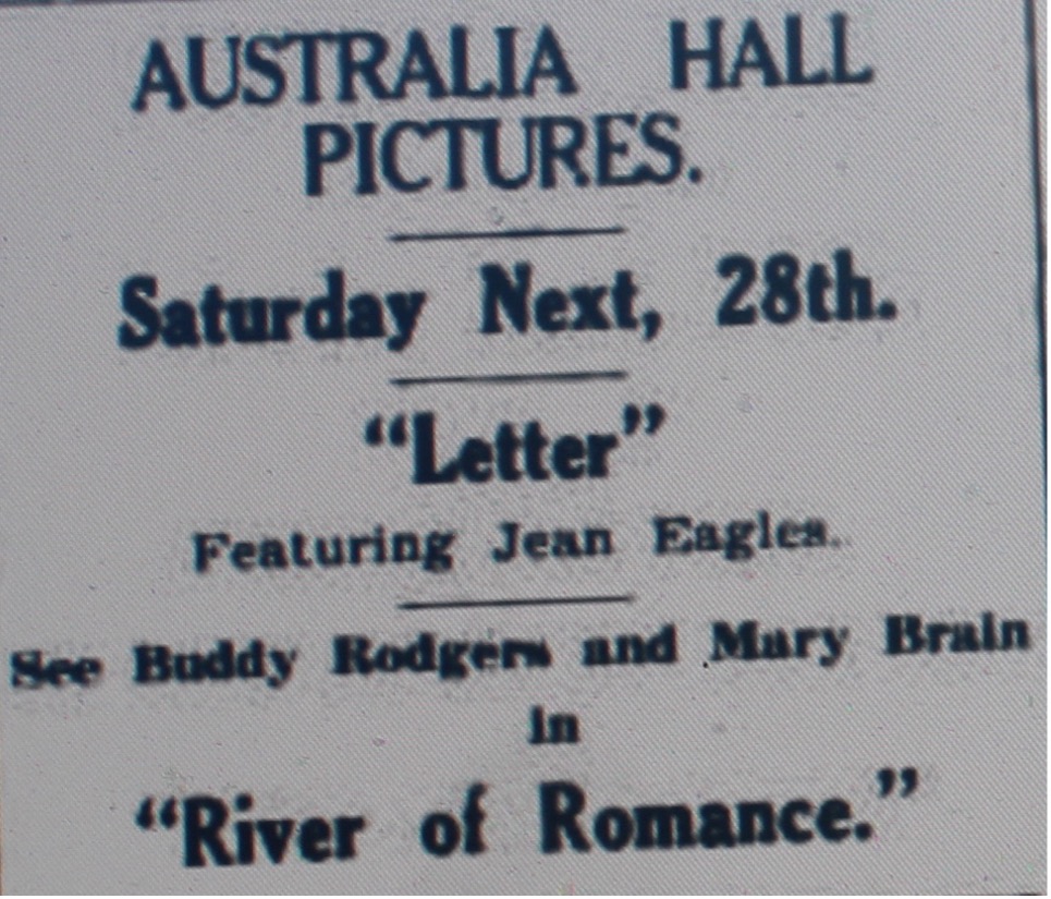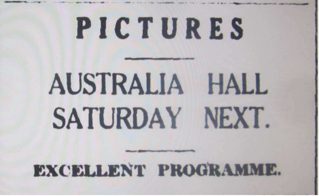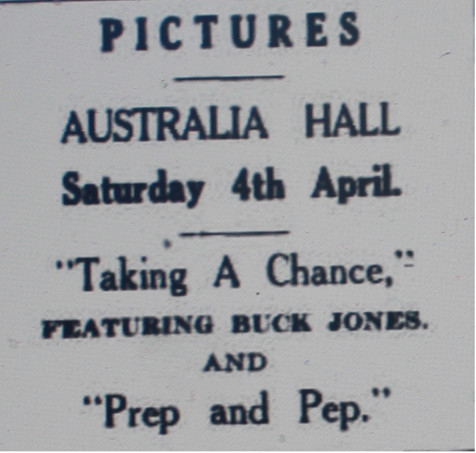 Most of the films shown at the Australia Hall, Tea Gardens, were newly released American productions. These films spanned the range of western, drama, comedy, war time adventures, and cartoons.