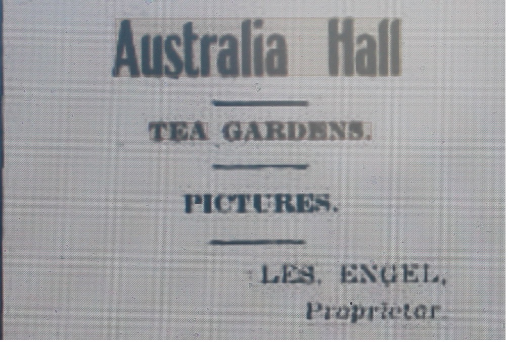 From 1930 to September 1932, Les Engel, a prominent businessman in Port Stephens, operated a cinema on Saturday nights in Australia Hall at Tea Gardens.