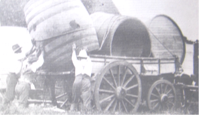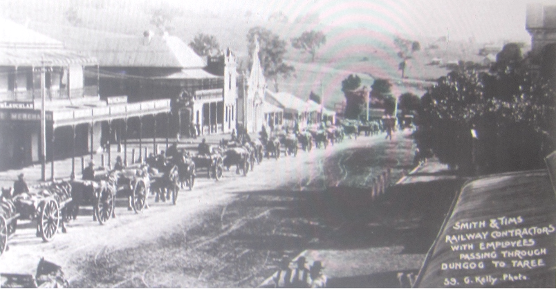 Smith and Tims, railway contractors with employees, passing through Dungog on the way to Taree