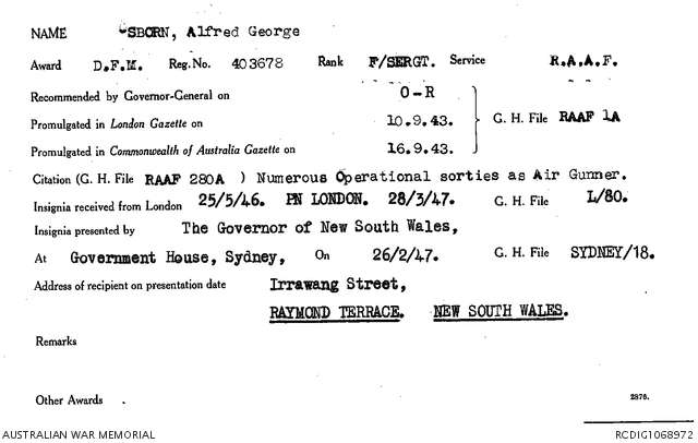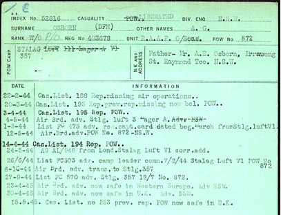 Prisoner of War Enquiry Card for Alfred George Osborn who received the Distinguished Flying Medal [D. F. M.] [University of Melbourne]