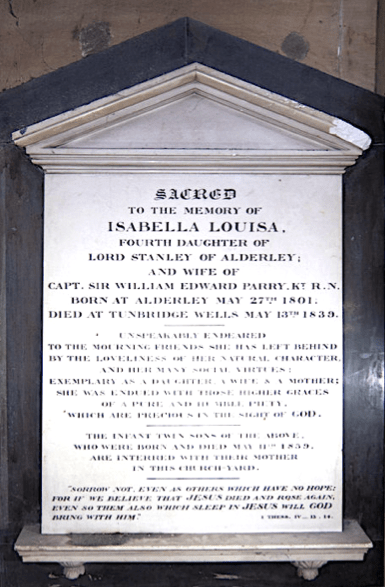 Isabella Parry died on 13 May 1839 at Tunbridge Wells, England, two days after giving birth prematurely to twin boys who did not survive. She and the twins were buried together at Trinity Cemetery, Tunbridge Wells.