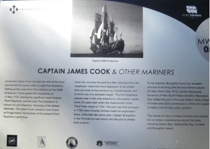 Captain James Cook is commemorated on a plaque along the Port Stephens Mariners Walk Heritage Trail that stretches from Soldiers Point to Salamander Bay.