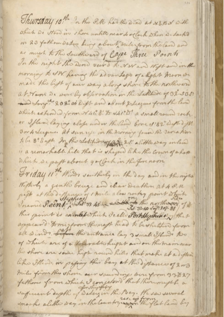 An extract from the journal entry of Captain James Cook for 11 May 1770, in which he sights and names both Point Stephens and Port Stephens, is illustrated below: