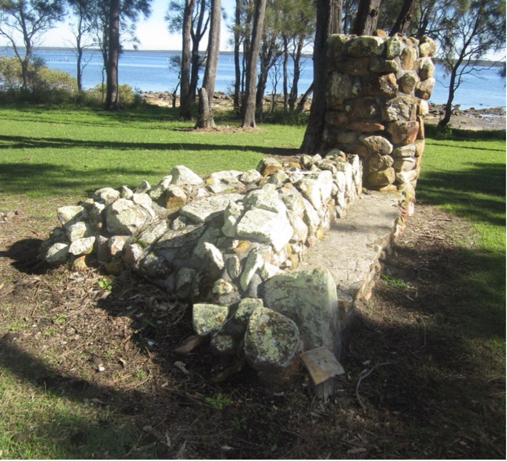 Restored convict lime kiln at Sunset Park [also known as the Tanilba Bay Heritage Precinct] incorporating a bench seat. Convicts burnt oyster shells in the kiln to produce lime, which was used to construct the walls of Tanilba House and other features [Author photo – 2013]