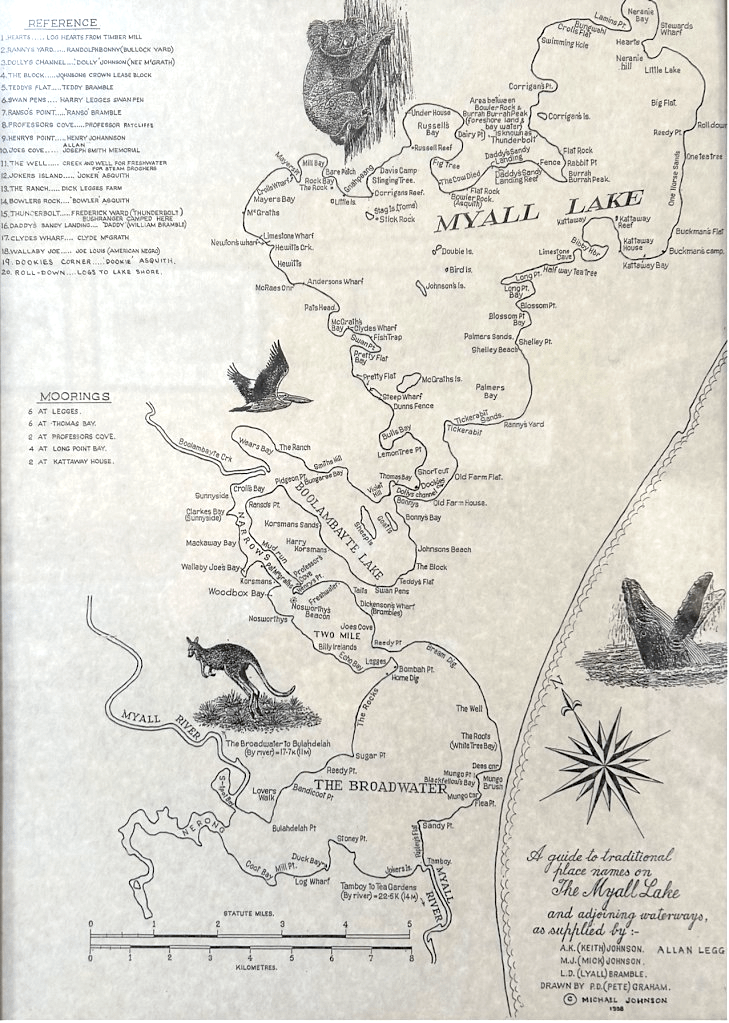 Map of traditional place names on the Myall Lake and adjoining waterways. Drawn by P. D. (Pete) Graham. [Prepared by Michael Johnson, 1998, and on display at the Inner Light Museum, Nelson Bay]