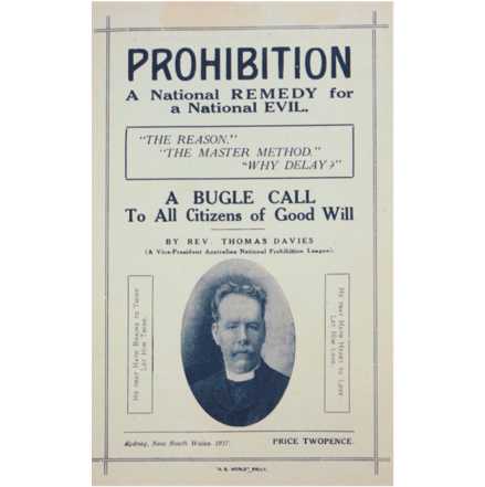 Cover of a 36-page book written by Rev. Thomas Davies entitled ‘Prohibition, A National Remedy for a National Evil’ – published in Sydney in 1917