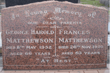 Grave of George Harold Matthewson and Frances Matthewson at Stockton Cemetery.