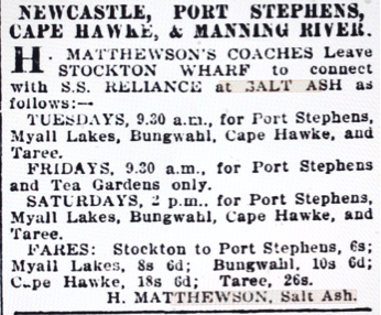 - Ride by a Matthewson coach from Stockton to Salt Ash, followed by a steamer trip to Port Stephens with a stop at Tea Gardens;
