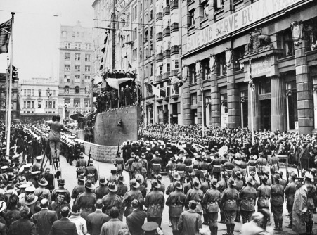 Opening of ‘Tank Week’ opposite the Commonwealth Bank, Martin Place, Sydney – April 1918 [Australian War Memorial]