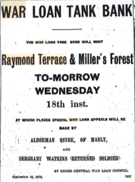 Advertisement for the War Loan Tank Bank visit to Raymond Terrace and Millers Forest [Newcastle Morning Herald and Miners’ Advocate, 17 September 1918]