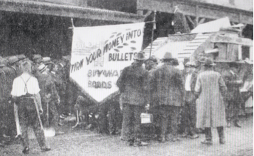 Merchants in Sussex Street, Sydney, listening to the appeal for investment in the War Loan. The sign reads: ‘Turn your money into bullets. Buy War Bonds’ [Sydney Mail – 17 April 1918]