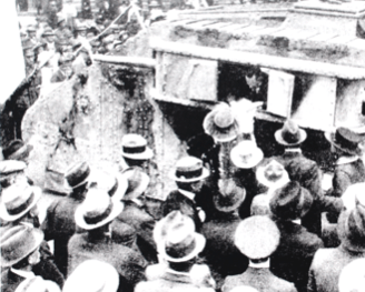 The crowd that witnessed the ceremony was surprisingly large, when it was considered that not one-quarter of it had any chance of hearing one word in ten of what was said. The space kept clear about the vessel was unusually large, and even those in the front row must have had difficulty in hearing the speeches. The speakers, too, faced great difficulties. They were high up, and they were speaking against a strong wind. Still, it little mattered as far as the enthusiasm of the hundreds listening was concerned. They know what it was all about, and they cheered heartily when they got the cue either from those in front or from a particularly expressive gesture of the speaker. Many of them did more than cheer. A party formed up while the Governor was speaking, and soon afterwards boarded the ship, and, at the point of a fountainpen, demanded bonds. “I want £10,000 bonds,” said one; “£5000 for me!” chimed in two others. This went on until it seemed that the inclement weather had not, after all, depressing influence on the takings of the first official day of the new loan. …..