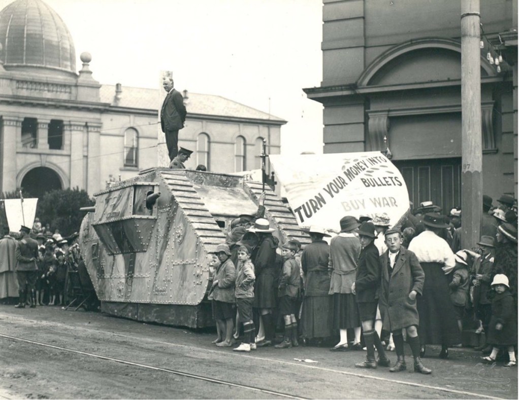 The first War Loan Tank Drive commenced in Sydney in April 1918, to promote sales of War Bonds for the Commonwealth’s Sixth War Loan.