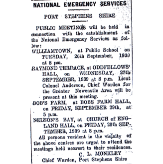 The National Emergency Services scheme commenced at Williamtown, Raymond Terrace, Bobs Farm and Nelson Bay [Raymond Terrace Examiner and Lower Hunter and Port Stephens Advertiser, 21 September 1939]