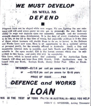 Defence and War Loan application invited [Raymond Terrace Examiner and Lower Hunter and Port Stephens Advertiser, 7 March 1940]
