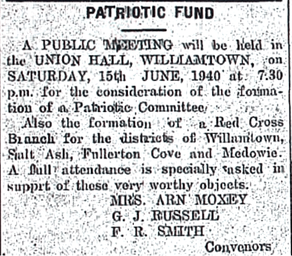 Patriotic Fund formed at Williamtown [Raymond Terrace Examiner and Lower Hunter and Port Stephens Advertiser, 13 June 1940]