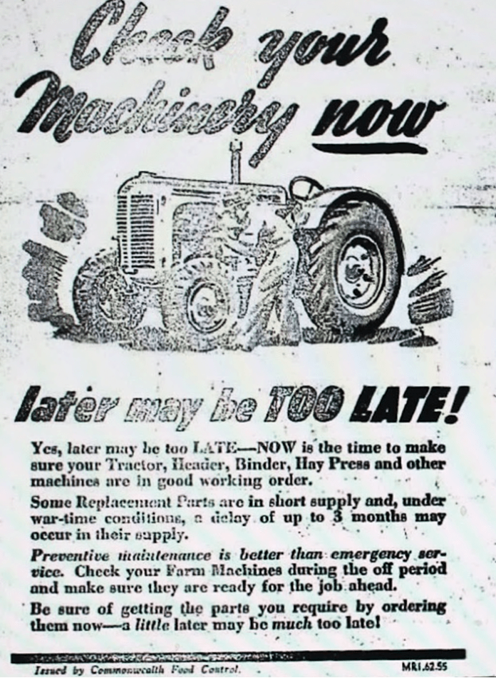 Farmers urged to maintain their machinery in working order [Raymond Terrace Examiner and Lower Hunter and Port Stephens Advertiser, 12 July 1945]