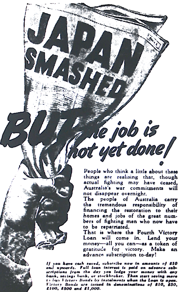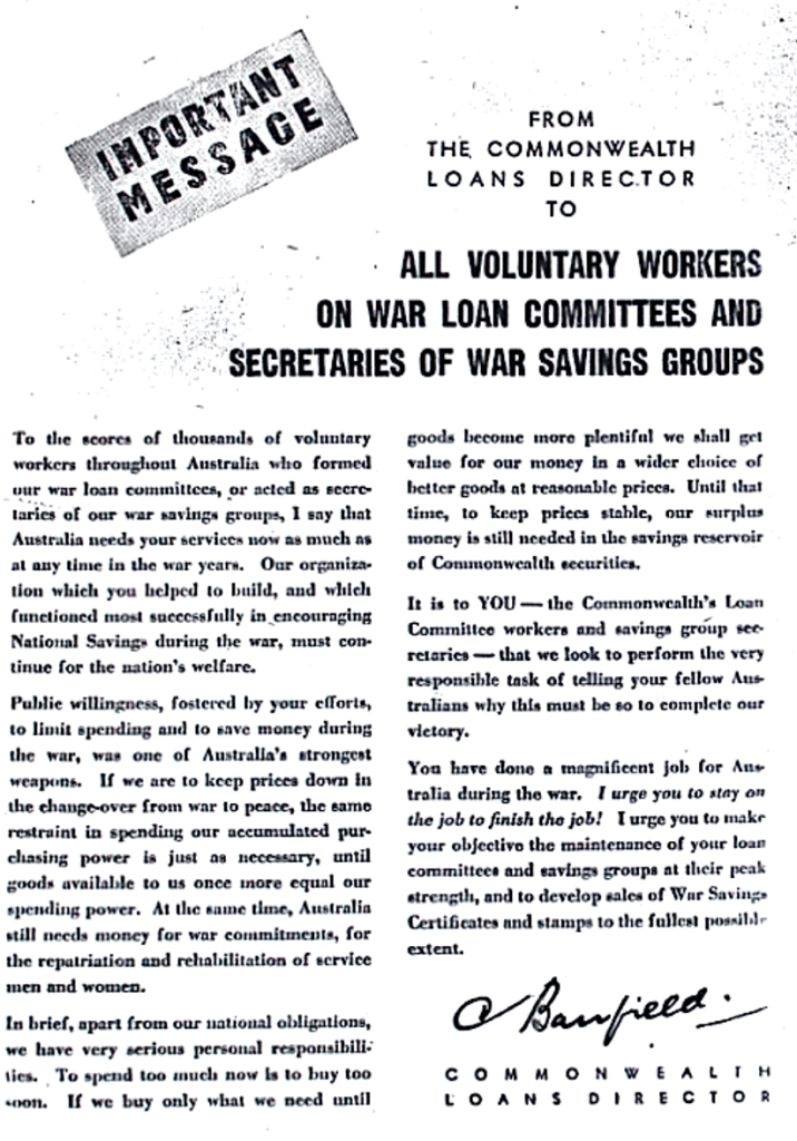 Volunteer workers promoting War Loans and War Savings Stamps urged to continue their work after the war had concluded [Raymond Terrace Examiner and Lower Hunter and Port Stephens Advertiser, 10 January 1946]