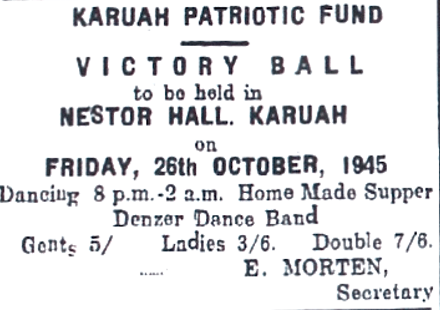 Victory Ball held by the Karuah Patriotic Fund [Raymond Terrace Examiner and Lower Hunter and Port Stephens Advertiser, 18 October 1945]