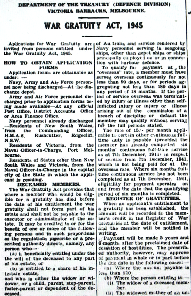 Australian War Gratuity Act 1945 established a’ free gift’ payment for World War II service members in recognition of honourable service [Top section of the advertisement as published in Dungog Chronicle, 16 November 1945]