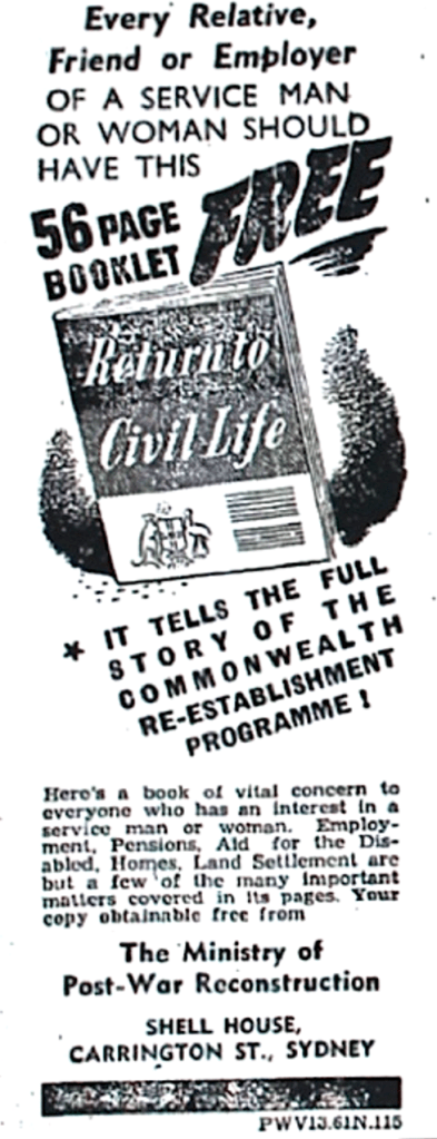 ‘Return to Civil Life’ booklet offered to former military personnel to assist with rehabilitation [Raymond Terrace Examiner and Lower Hunter and Port Stephens Advertiser, 20 December 1945]