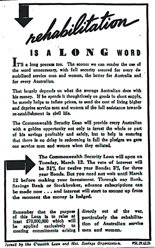 Notice of forthcoming Commonwealth Security Loan [Raymond Terrace Examiner and Lower Hunter and Port Stephens Advertiser, 7 March 1946]
