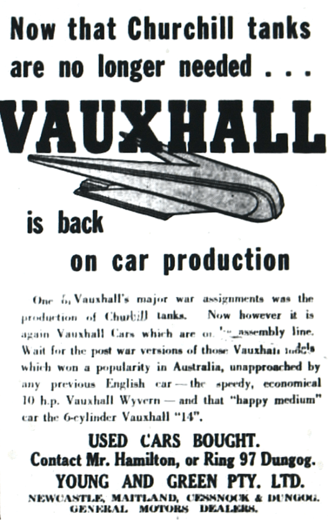 Vauxhall in England announced it had switched production from tanks back to cars [Dungog Chronicle, 22 March 1946]
