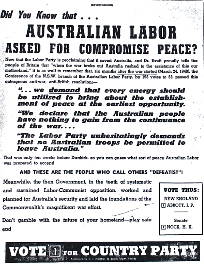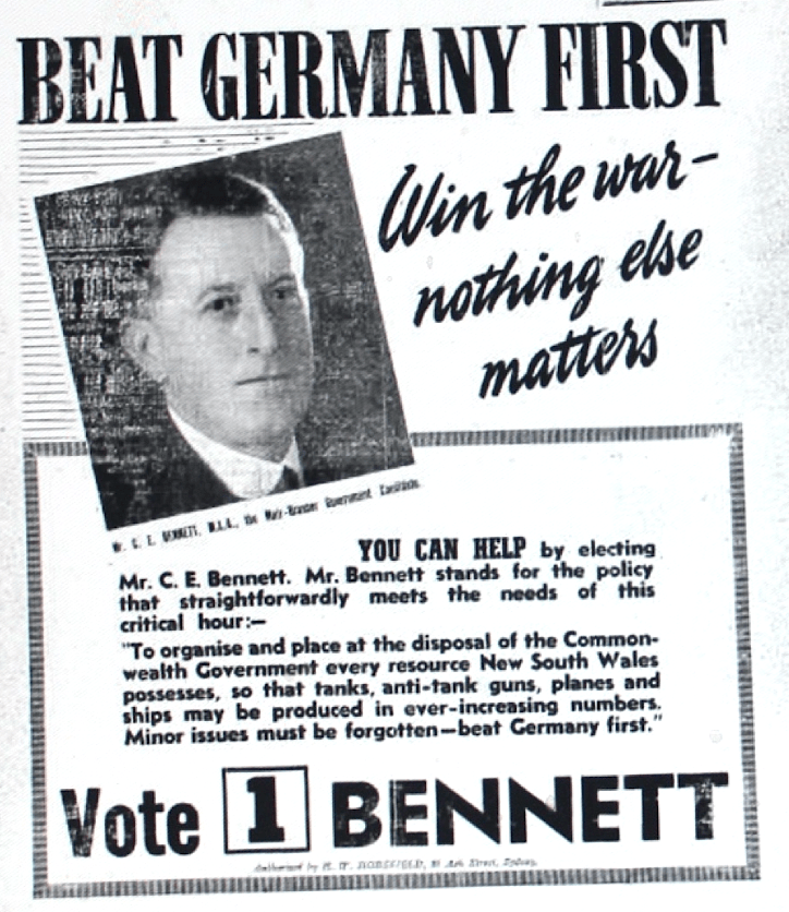 Support of the NSW war effort viewed as a political winner [Raymond Terrace Examiner and Lower Hunter and Port Stephens Advertiser, 1 May 1941]