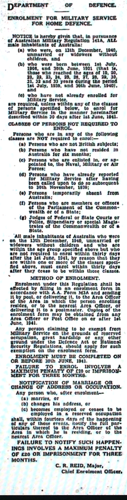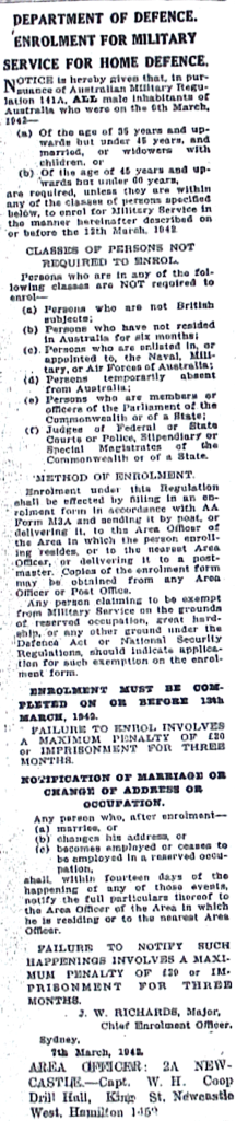 Conscription for Homeland Defence introduced [Raymond Terrace Examiner and Lower Hunter and Port Stephens Advertiser, 2 March 1942]