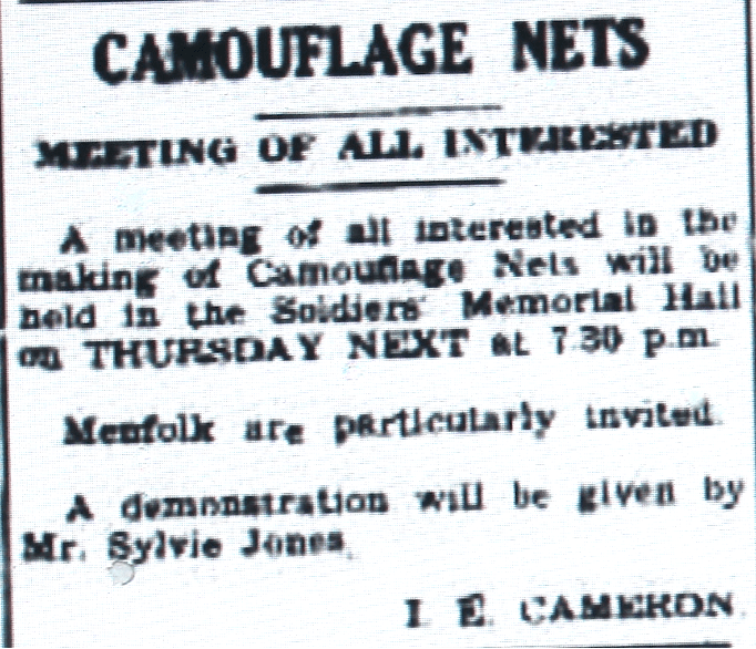 Camouflage nets were to be made in the Soldiers Point area [Dungog Chronicle, 27 June 1941]