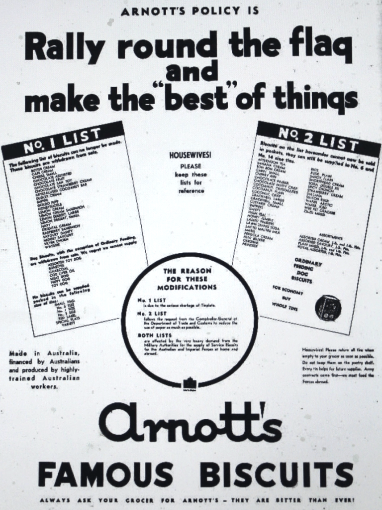 Many types of Arnott’s biscuits were withdrawn from manufacture due to the shortage of ingredients and packaging tin plate. Most biscuit varieties withdrawn from sale are no longer manufactured by Arnott’s [Dungog Chronicle, 4 July 1941]