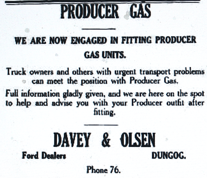A gas producer using charcoal as the fuel, could be fitted to motor vehicles to reduce use of motor spirit [Dungog Chronicle, 25 July 1941]. Also see advertisement in Dungog Chronicle, 18 October 1940 above]
