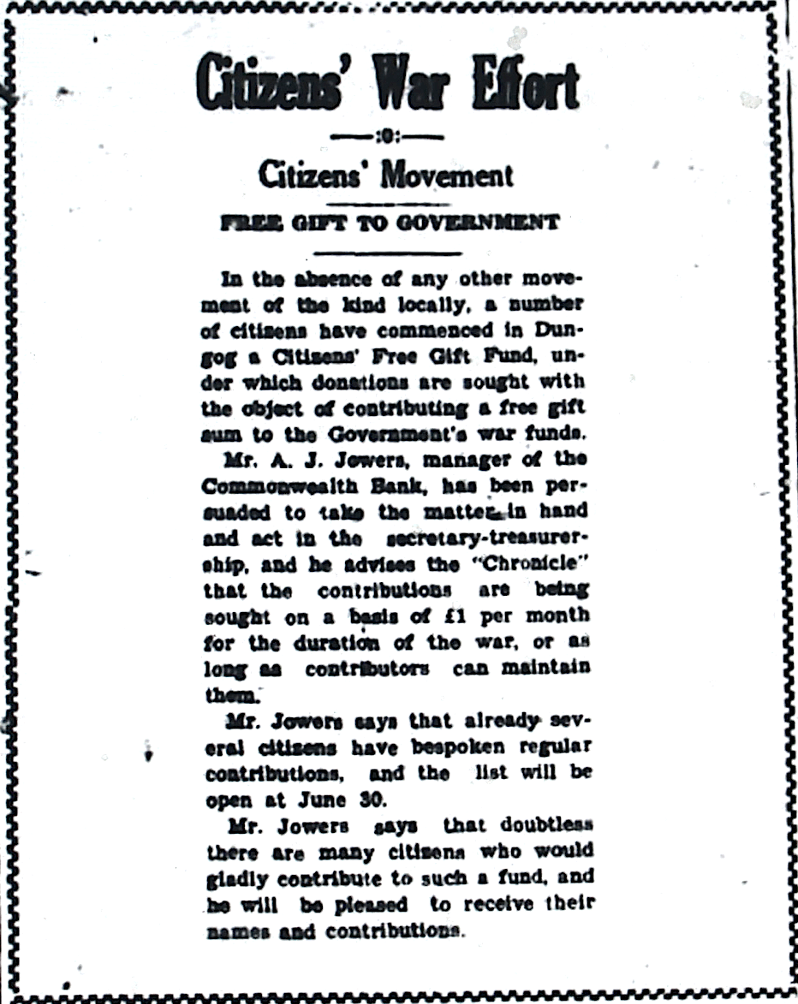 Citizens’ Free Gift Fund formed to provide war funds to Government [Dungog Chronicle, 14 June 1940]
