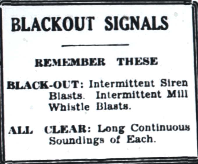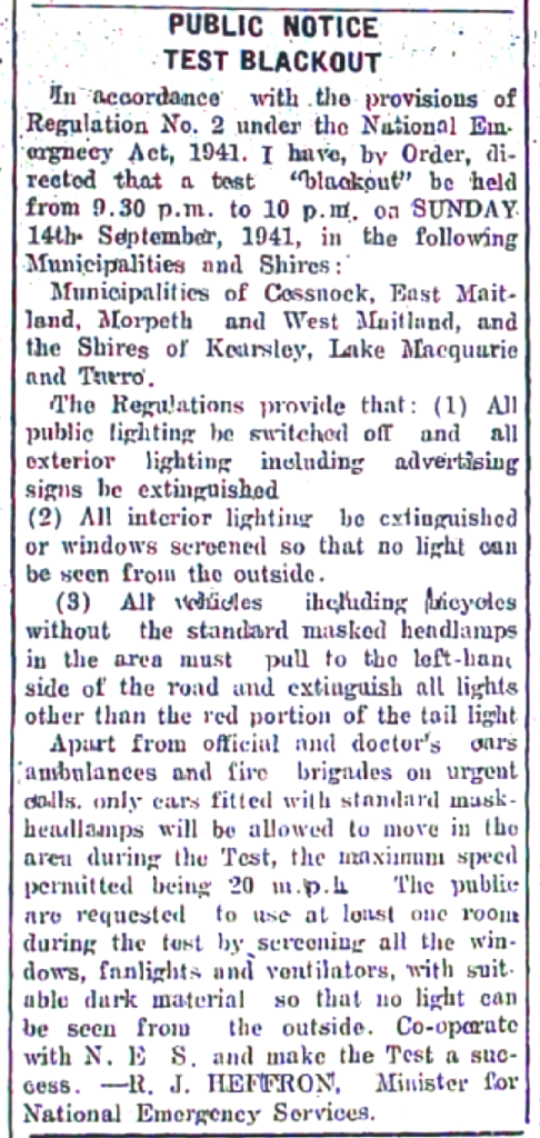Procedures for a test blackout. Blackouts were required at night, so the enemy aircraft were not able to identify areas of population [Raymond Terrace Examiner and Lower Hunter and Port Stephens Advertiser, 11 September 1941]