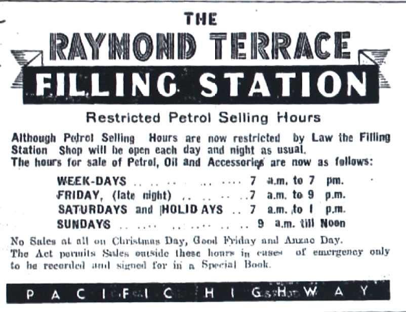 Restrictions to petrol selling hours introduced [Raymond Terrace Examiner and Lower Hunter and Port Stephens Advertiser, 18 September 1941]
