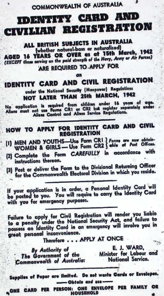Identity Cards and civilian registration introduced [Raymond Terrace Examiner and Lower Hunter and Port Stephens Advertiser, 12 March 1942]