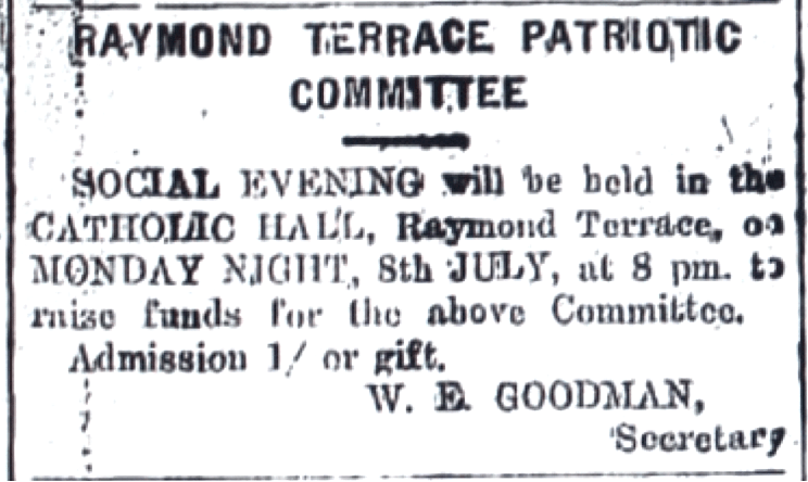 Fund raising social evening held by the Raymond Terrace Patriotic Committee [Raymond Terrace Examiner and Lower Hunter and Port Stephens Advertiser, 4 July 1940]