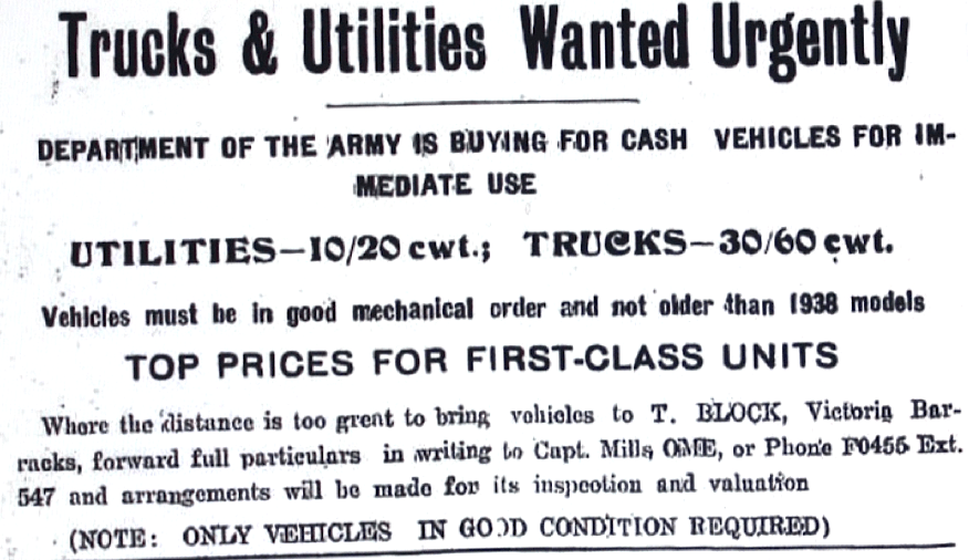 Government urgently sought to purchase trucks and utilities [Raymond Terrace Examiner and Lower Hunter and Port Stephens Advertiser, 19 March 1942]