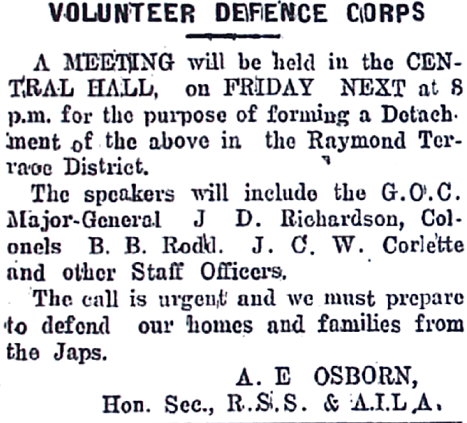 Detachment of the Volunteer Defence Corps to be formed at Raymond Terrace [Raymond Terrace Examiner and Lower Hunter and Port Stephens Advertiser, 19 March 1942]