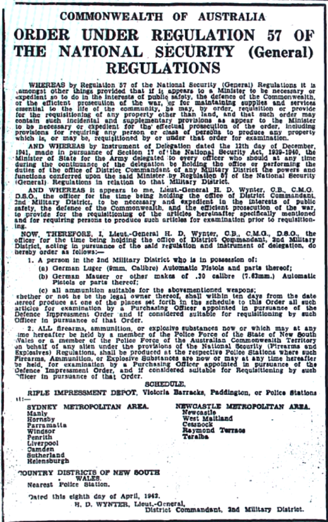 Certain types of German pistols requisitioned by Government [Raymond Terrace Examiner and Lower Hunter and Port Stephens Advertiser, 27 April 1942]