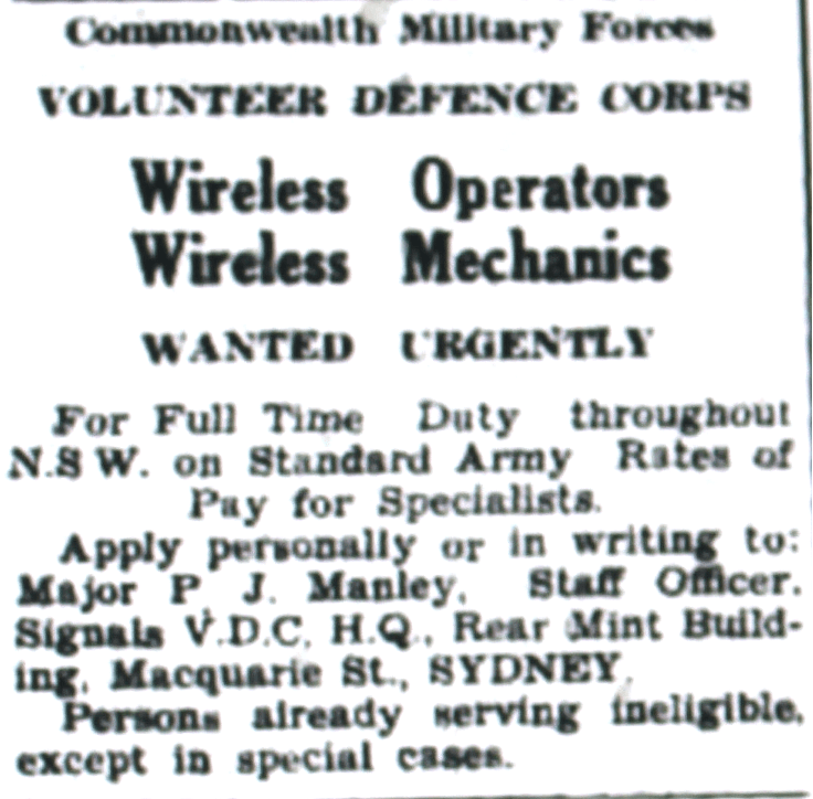 Volunteer Defence Corps urgently required wireless operators and mechanics [Dungog Chronicle, 24 April 1942]