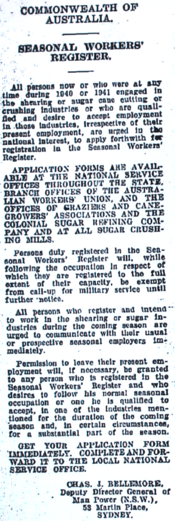 Seasonal workers register for shearers and sugar cane workers [Raymond Terrace Examiner and Lower Hunter and Port Stephens Advertiser, 28 May 1942]