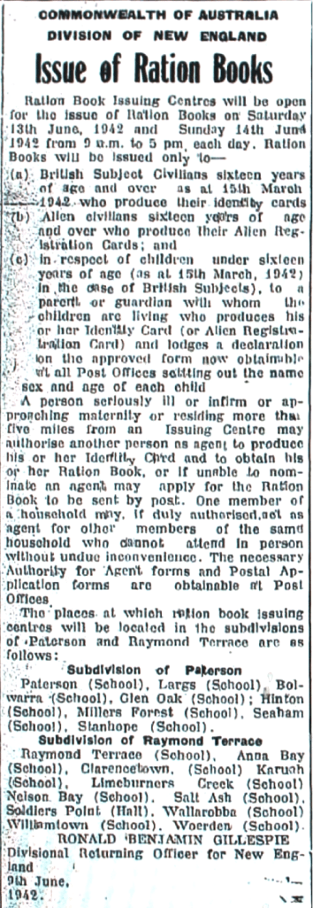 Ration Books introduced [Raymond Terrace Examiner and Lower Hunter and Port Stephens Advertiser, 11 June 1942]