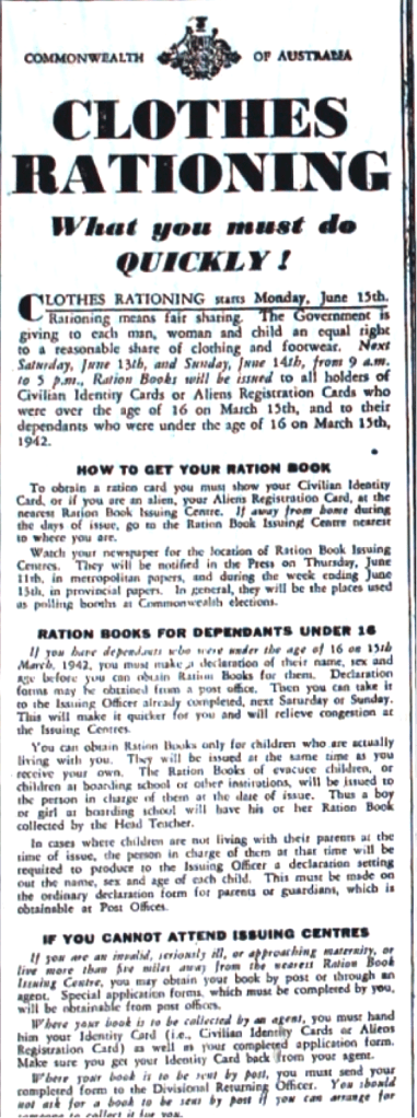 Clothing rationing introduced [Raymond Terrace Examiner and Lower Hunter and Port Stephens Advertiser, 11 June 1942]