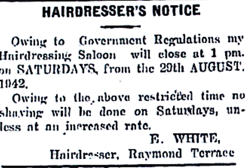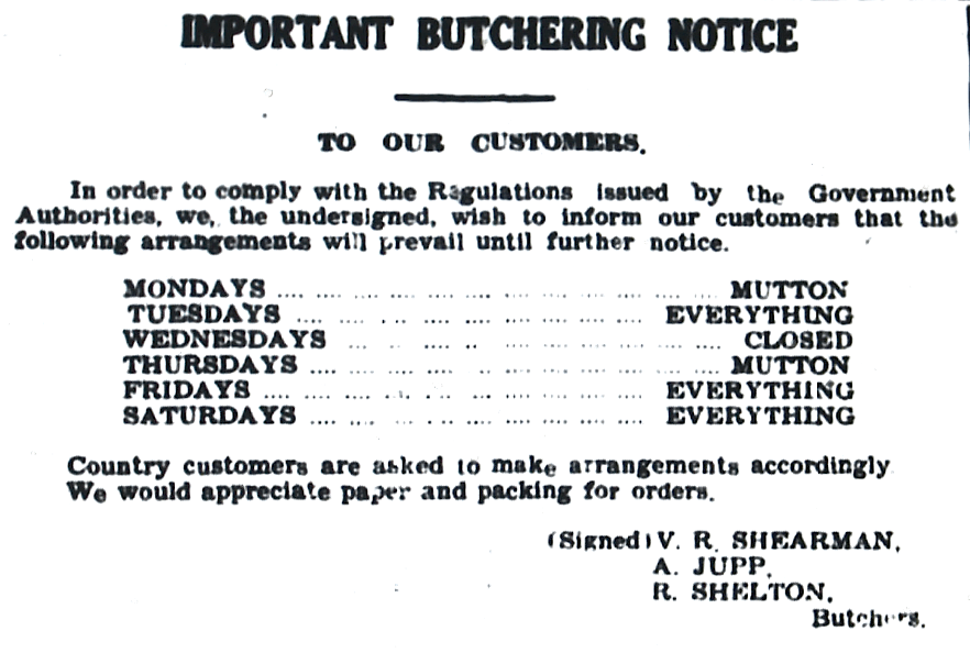 Raymond Terrace butcher announces reduced trading hours due to Government wartime regulations [Dungog Chronicle, 5 November 1943]