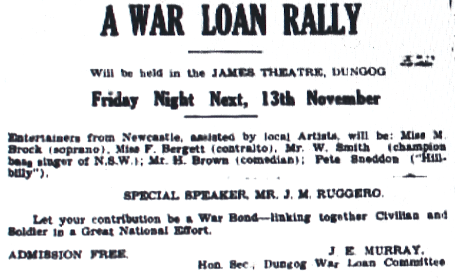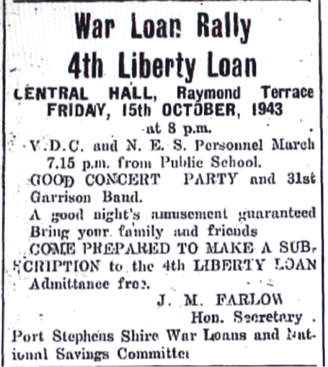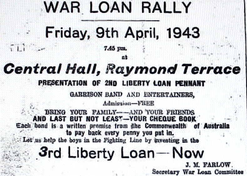 War Loan Rally for Third Liberty Loan held at Raymond Terrace [Raymond Terrace Examiner and Lower Hunter and Port Stephens Advertiser, 1 April 1943]