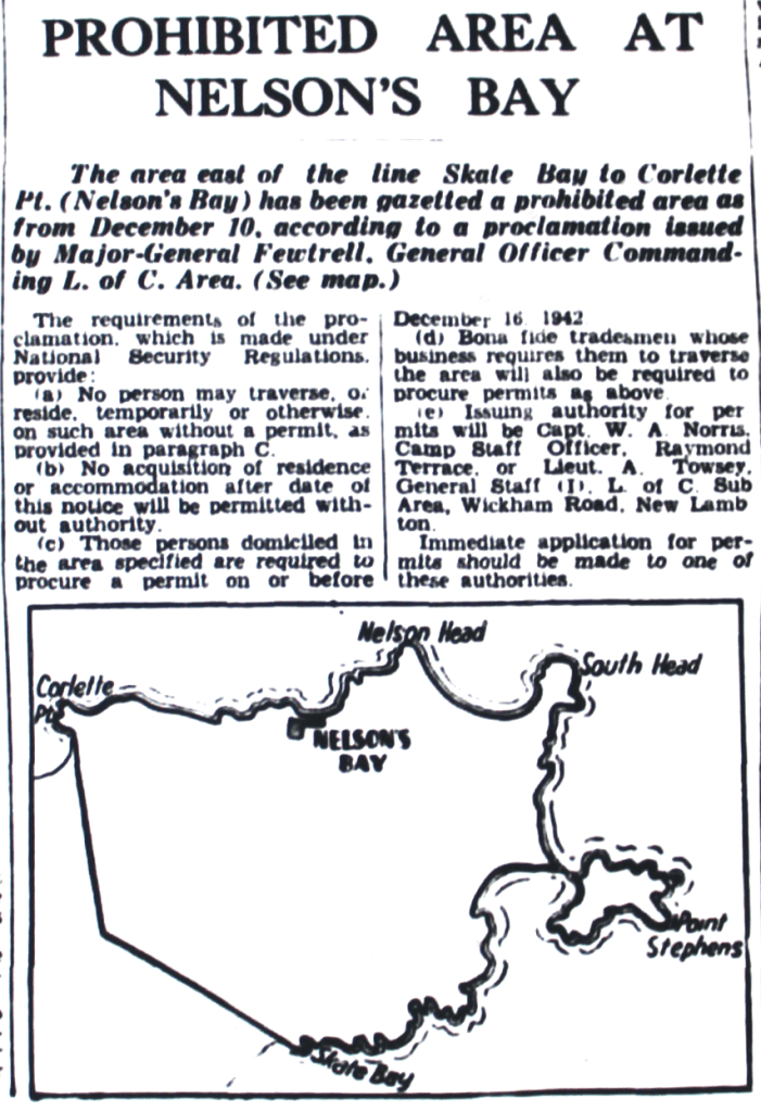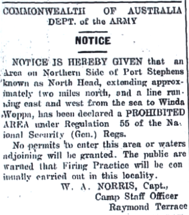 Northern side of Port Stephens declared an exclusion zone for military purposes [Raymond Terrace Examiner and Lower Hunter and Port Stephens Advertiser, 8 July 1943