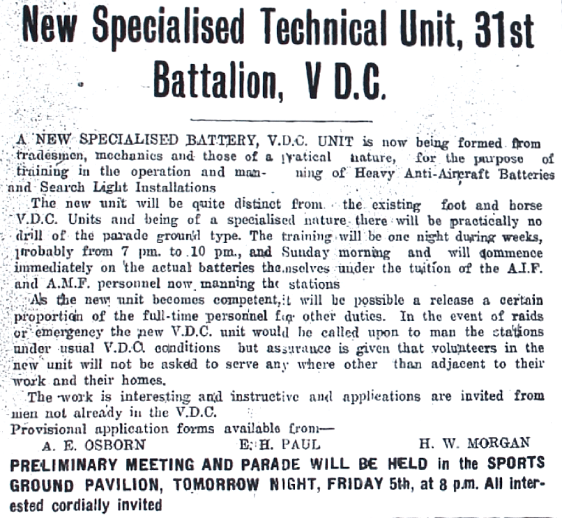 New Technical Unit of the V. D. C [Volunteer Defence Corps]formed at Raymond Terrace [Raymond Terrace Examiner and Lower Hunter and Port Stephens Advertiser, 4 March 1943]